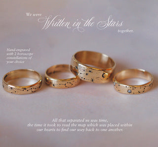 A celestial band for the ages. Hand-engraved with 2 horoscope constellations of your choice.