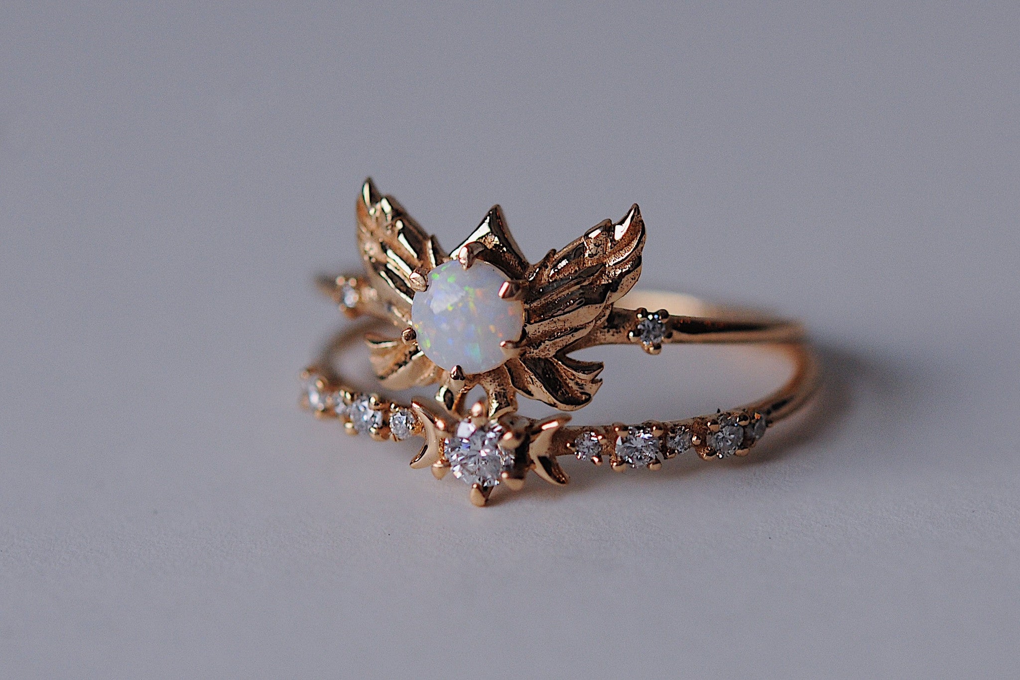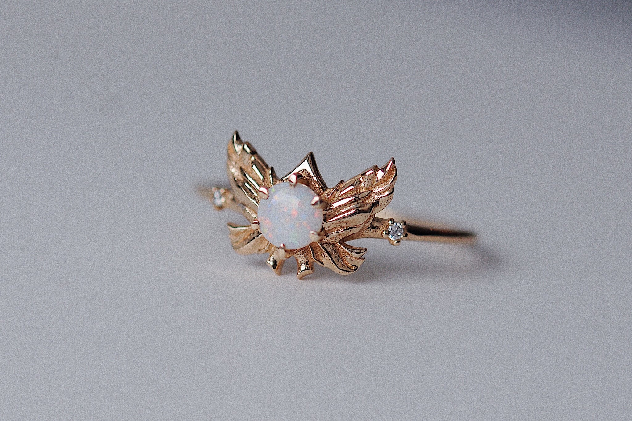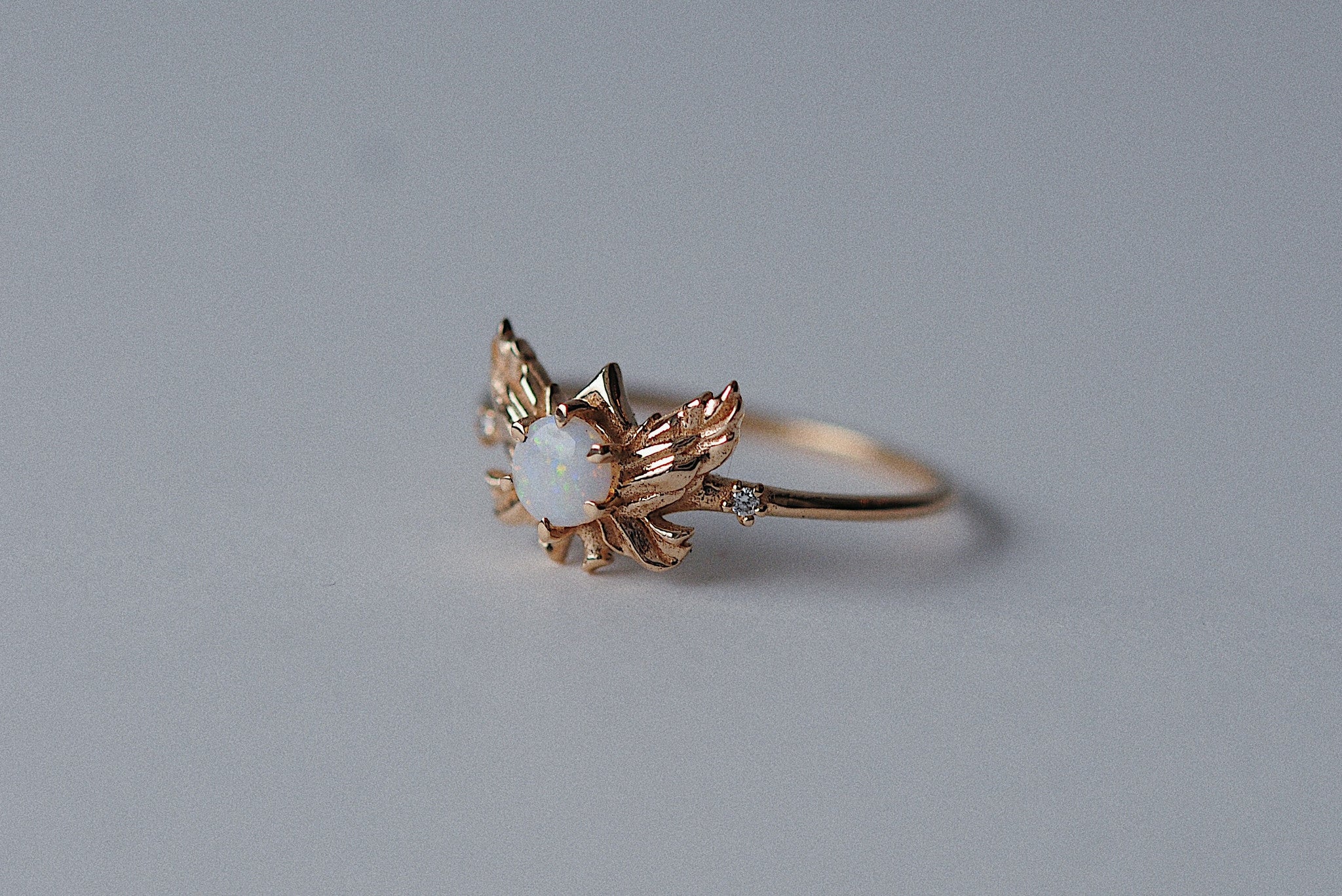 Featuring a beautiful 4mm Australian opal and 2 twinkling diamonds on a 1.2mm solid gold band.