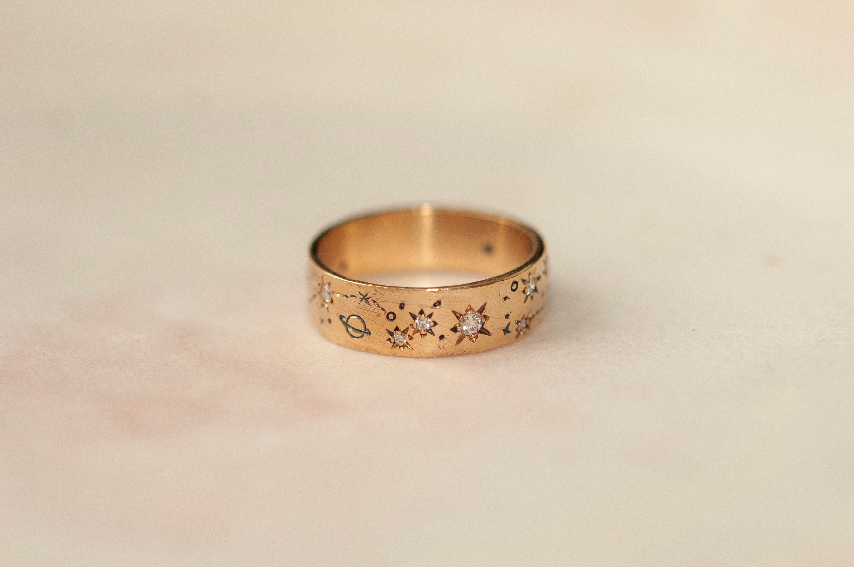 Available in 14k gold. Band measures approximately 7.5mm in width and is initially hand-carved in wax. Hand-engraved constellations and texture are hand-oxidized.